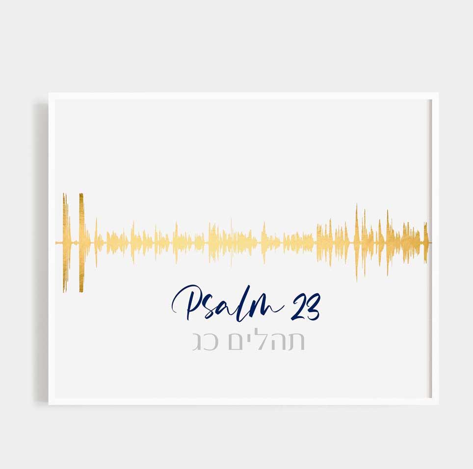 The famous Psalm of David! The golden sound waves reflect the vibration of peace and still waters that restore the soul. The Hebrew name of "Psalm 23" is gracefully written below.