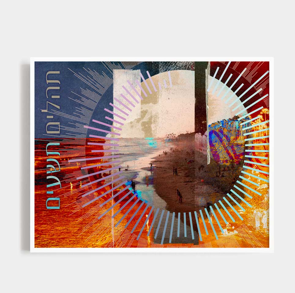 A radial sound-wave and mixed-media piece reflecting the vibrations of the oldest Psalm, Psalm 90, a prayer written by Moses with a back-drop photo of the beach at Oceanside, California.